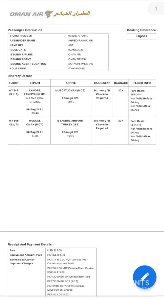 I am writing regarding flight WY-0242 & WI-105 on 1st January 2020 from IGI Airport Terminal 3 to Manchester Airport via Muscat with the scheduled departure time of 10:20am. My booking reference is TINVGI.
