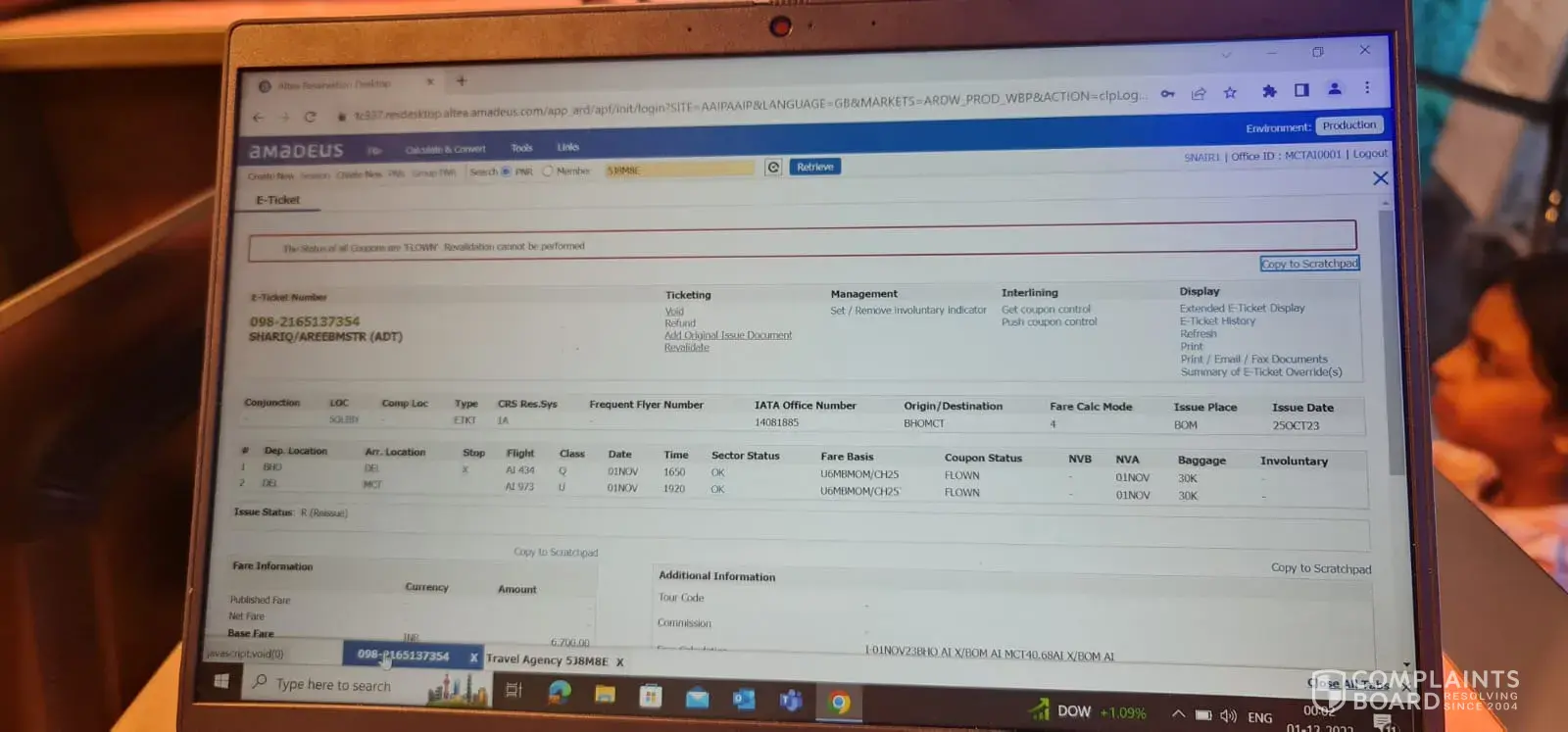 I received an email that my flight AI986 on 30th Nov 2023 has been delayed, and the new time was 12:35 instead of 22:30. I was at the airport at 9:30 where the check-in counter staff told me that all my 5 tickets were (exchanged) not available in their system. They asked me to call Air India or MMT, but both blamed each other. We tried to meet the staff of Air India there she tried to help us as well but she gave similar information. We left the airport at 1:30 and now we have to pay the fine as well since we're on the tourist visa, which has expired now. Now the status shows NO SHOW, but we were there at the airport for such a long time.
