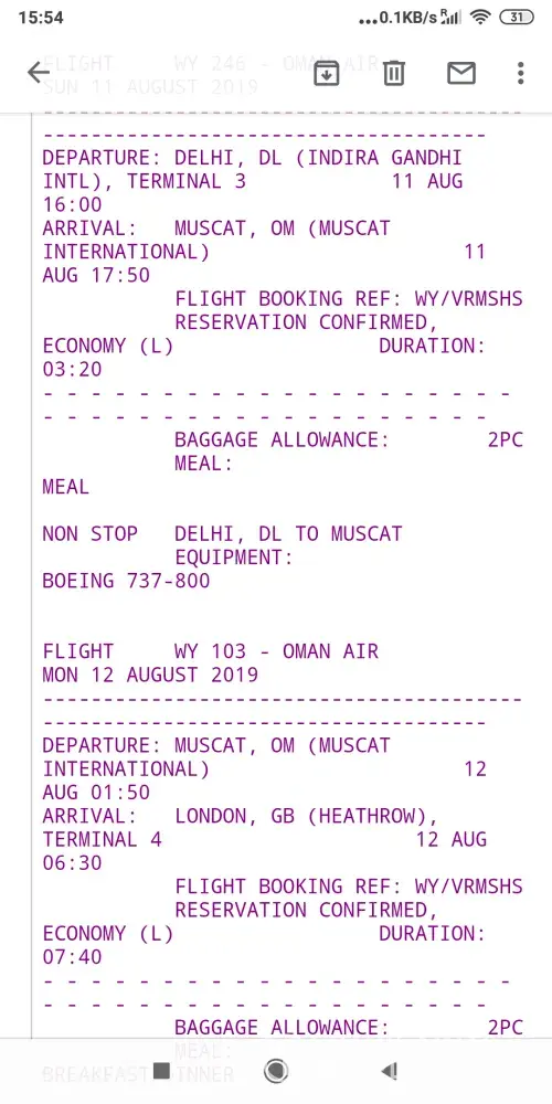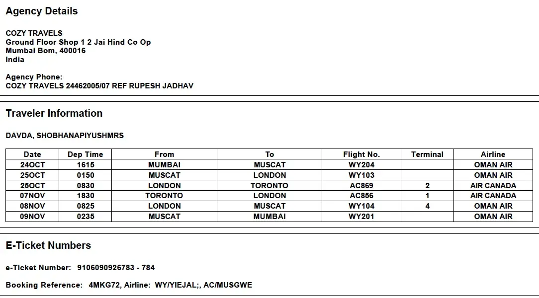 1. We started our journey from Thiruvananthapuram to Muscut - London - Toronto on 10th August 2019 via Oman air (flight no. WY 0226). The flight arrived 25 minutes late in London, as a result we result our Air Canada flight.