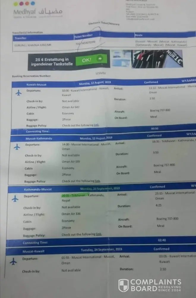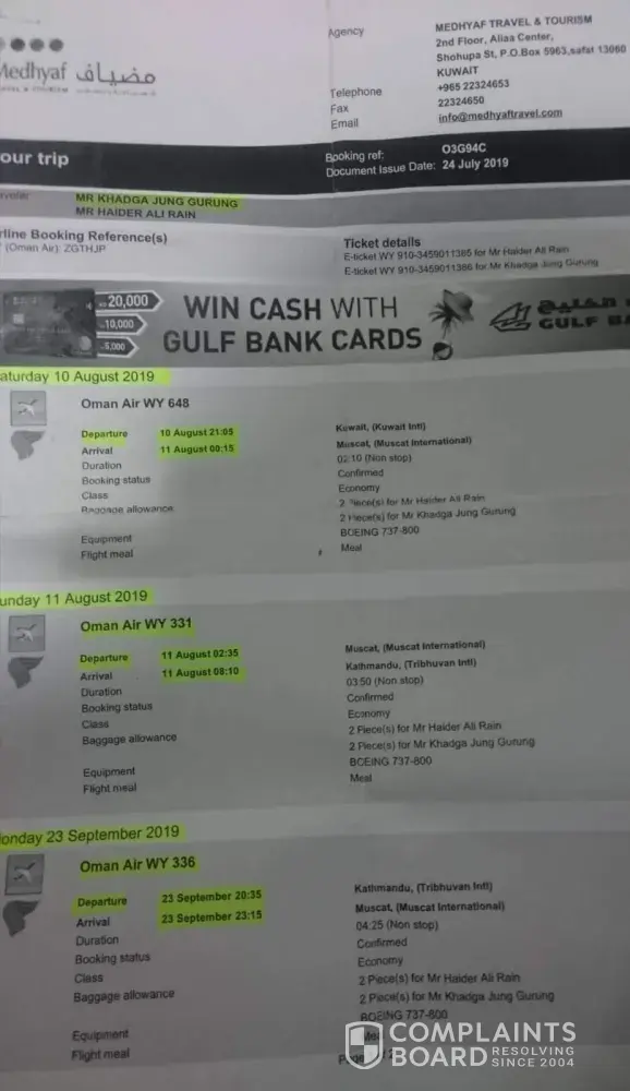 Then, I had to book another flight and pay for it. (Ticket: 910-[protected] & Booking Ref: O3G94C). I tried contacting the Oman Air airport office at the Kuwait Int. Airport but it was closed.