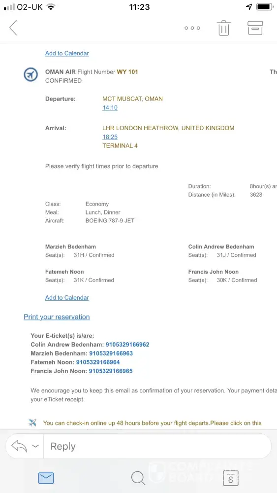 Flight: London - Muscat (WY0102 on 19th Aug 2050 seat no. 21B & A) and Muscat to Colombo (WY0373 on 20th Aug 0850 seat no. 21 B&A).