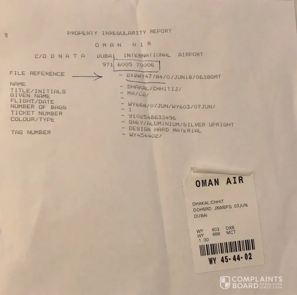 I had taken Oman air to fly from Doha-Muscat and Muscat-Dubai airport on 7th of June, I boarded properly from Doha with 2 luggage that is one my hand carry and other 29plus kg large luggage. upon arriving at Dubai airport baggage belt my luggage was missing hence I immediately went to the query desk and lugged complain (property irregularitiey report) immediately. after knowing all the scenarios airlines staff has promised me to deliver my luggage latest by 5pm same day to my location. and it's been now 5 days neither o got any confirmation nor any response. How horrible Oman air service is? Worst ever airlines travel with. I am new to Dubai as I have recite my self from Doha and all my belongings was there in my luggage. but due to the careless of staff it was lost or either misplaced and I do understand that but since how long I will keep on extend my patience. I am just left with single pair of clothes which I was wearing while traveling.
