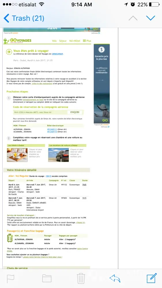 When I came to Dubai, I saw through my bank statement that you take two times the price of the tickets. Once from Oman air and the other from Go voyage?
