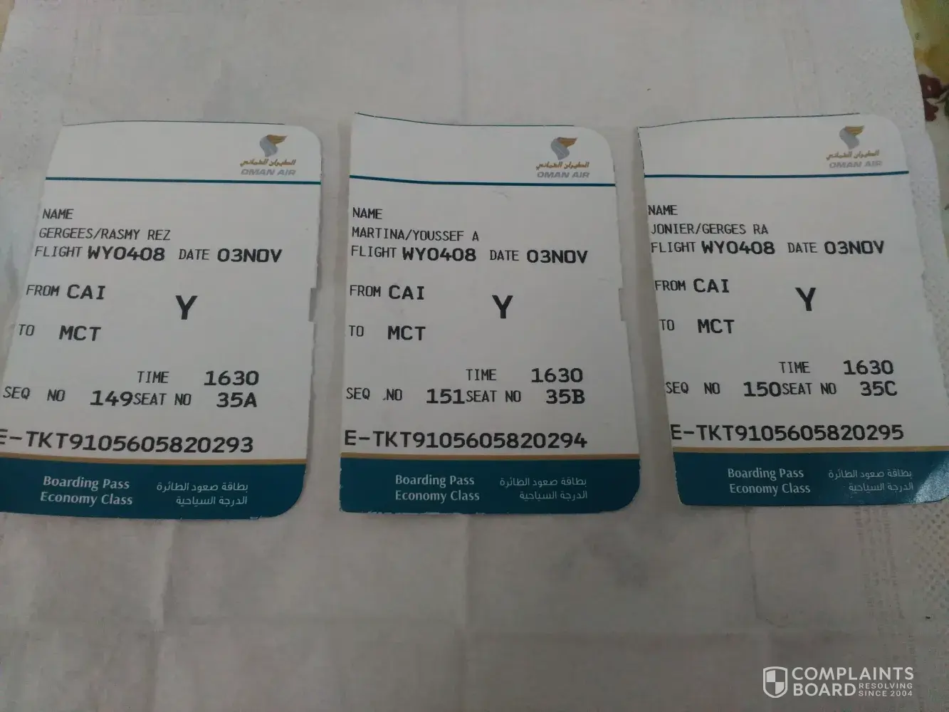 I, along with three other people, had an economy flight from Kathmandu to Muscat (going onto London) on the 12th April 2018 number WY336T.