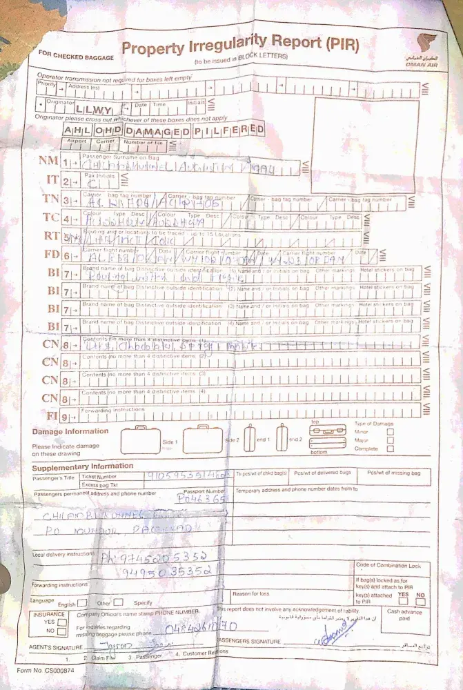List of my items are listed as I can not remember all the item but I have mentioned all the item details which I can remember. really horrible experience with Oman air and I wish even my enemy should not be treated like this. So far no call confirmation from airlines. isnt it is strange. I am literally having tough time to get my luggage back as I have my all belongings and some important documents like marriage certificate/academic certificate etc were there which can not be compensated or reproduced at any cost. Hope someone will revert back to me