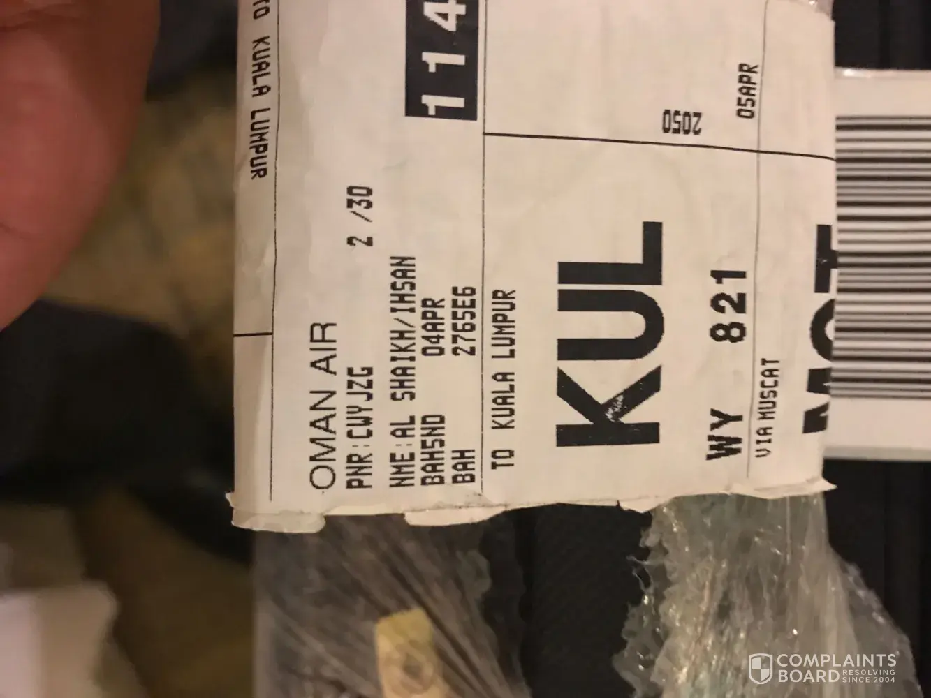 On 4 April 2018, I traveled from Bahrain to Kuala Lumpur via Muscat on your flights WY 654 and WY 821 respectively. Upon my arrival at my hotel on 6 April 2018, I was thoroughly dismayed when I discovered that 2 of my suitcases were badly damaged.
