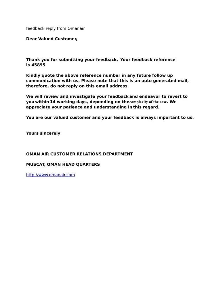 i had compensation of $100 from oman air due to the delay of their flight on 17th august 2017. thy provided me with an Email to send my Bank details to that (UK.RES@omanair.com) i did send them on 19th of august as they requested. its been about 8 days now i had no response from them. i have provided the details below