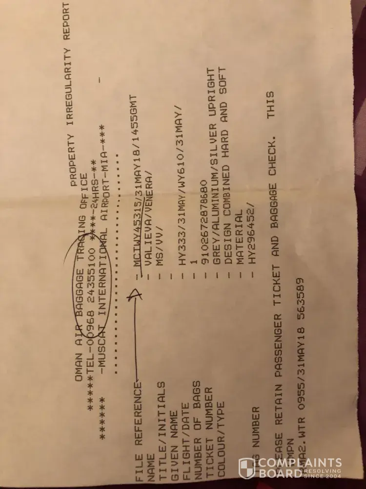 Oman Air complaint about baggage handling and the damage caused to the check-in baggage.