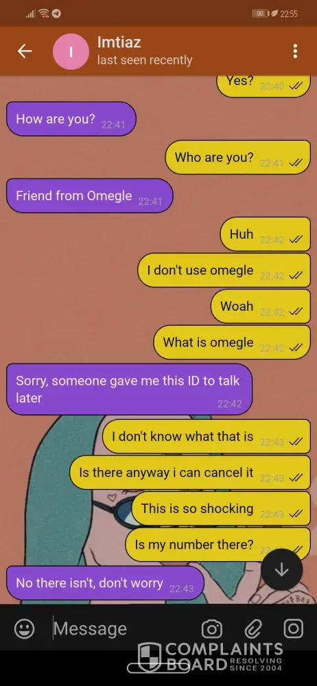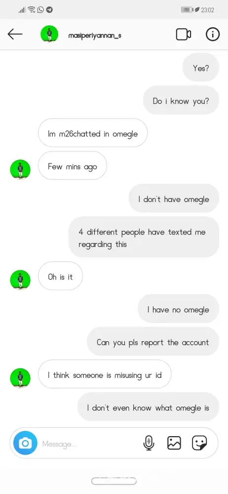 I have recently received men sex chatting me on Instagram, telegram and sending dick pictures on Snapchat. All of them said i texted them and have told them I am horny on omegle. However i have never once visited omegle nor knew of its existence till now. I even changed my Instagram and telegram account however still received chats. I am not sure who or what is using my names across all the platforms but please look into it. The men who realised that they have been talking to someone else have agreed to assist me in reporting this person, so please do look into it.