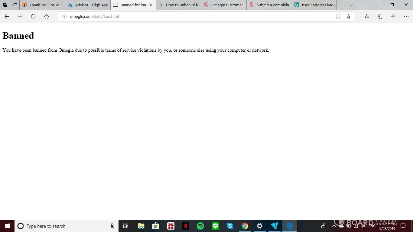You have been banned from Omegle due to possible terms of service violations by you, or someone else using your computer or network.