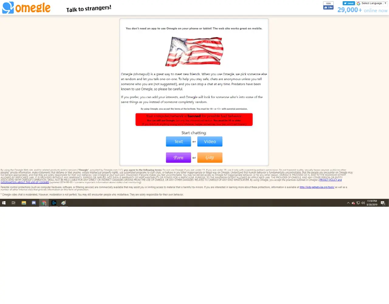 I have cerebral palsy. I'm very much debilitated and don't have many close friends. so I thought I'd go on Omegle and meet people who I can talk to. Instead, what I got was men showing me their dicks. One guy, claiming to be a moderator, asked me to remove my blouse. I bluntly refused. A white screen quickly appeared on my computer telling me I was banned for vulgar behavior and I found myself looking at a video of a five year old girl giving an old man a blowjob. How disgusting. Why ban people like myself when there are so many people verbally abusing other people and exposing their genitalia on camera?