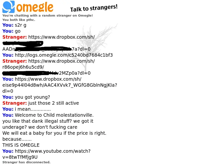 there are interest for Omegle chat which are only used for sharing child pornographic material this is an outrage.