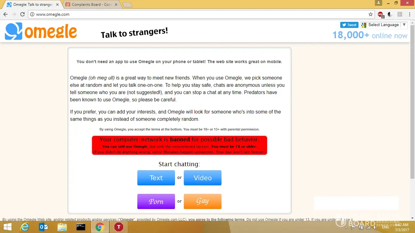 Below is the message given to me when trying to access omegle.com, as well as a screenshot.