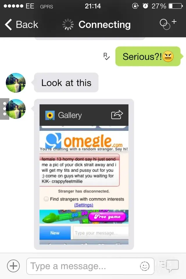 I just had 5 kik messages from 5 random people who I've never met before or never head of telling me that my kik username is being given to strangers and pedos could find out about it saying and I quote what people have been sending the message about "female 13 horny don't say hi just send me a pic of your d*** and I will get my t***and p**** out for you" FIRSTLY IM NOT 13, secondly I don't use omegle or give my name out and thirdly there's some sick people out in this world! I'm not that sort of kid I just enjoy playing football and hanging around with people I KNOW! This site should definitely be removed!