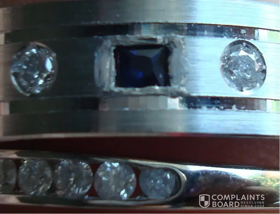 The attached picture is what their jewel craftsmanship looks like. Terrible. The right diamond on the thin band is chipped from being shoved into the small setting edge.