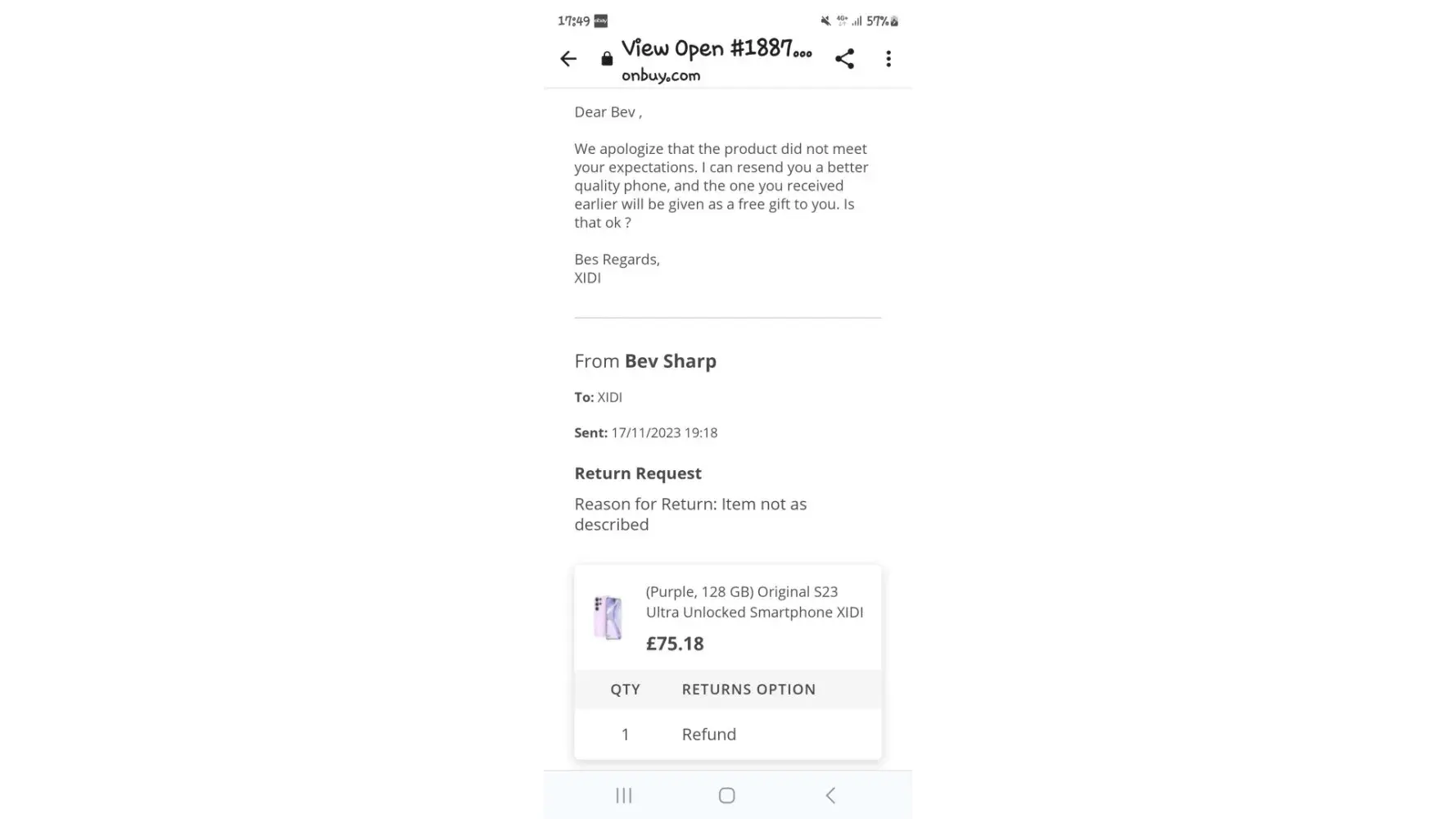 Told I would get refund but since no communication and no refund. OnBuy customer service team not responding since 5-6 days but supposed to resolve in 48 hours! Nobody answering me to resolve.