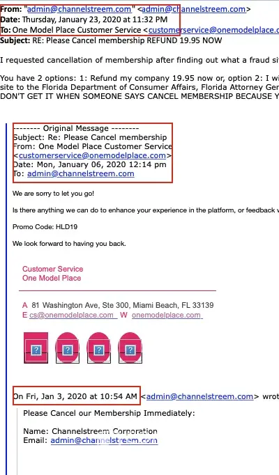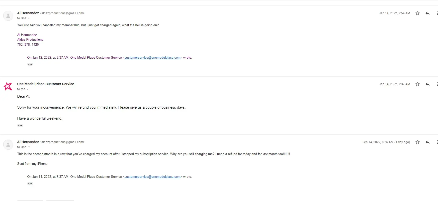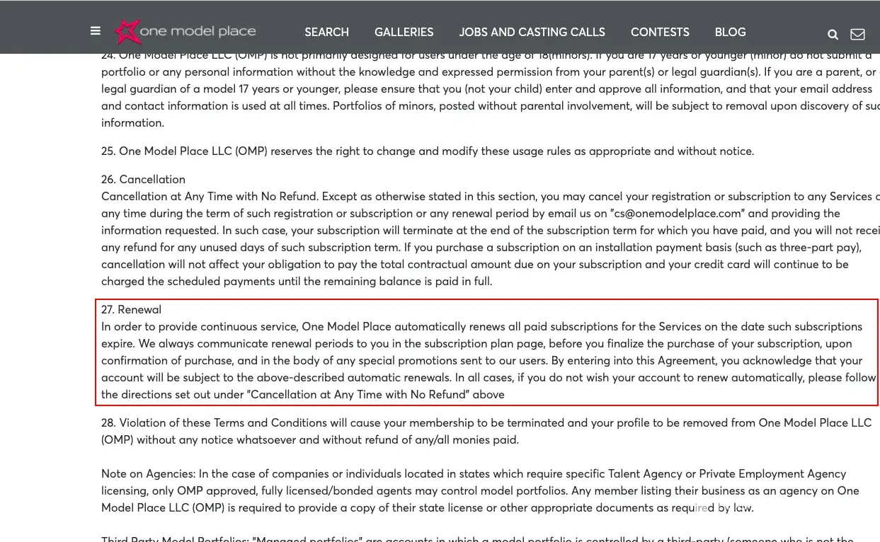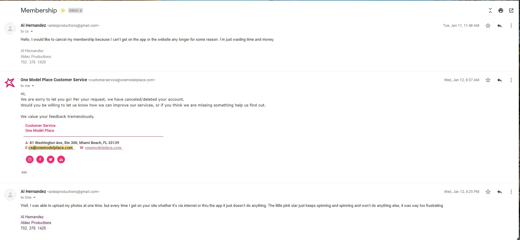 I cancelled my subscription to onemodelplace.com because I was having too many issues trying to get into my account through the app and online through the website. They replied back a few days later acknowledging my cancellation and then a few days later I noticed that they charged me again, so I contacted them again to cancel my subscription and told me once again that they took care of it but noticed once more that they charged me for February. Their contact page only has an email, no phone number whatsoever so you can never speak to anyone EVER which obviously is how they like it.