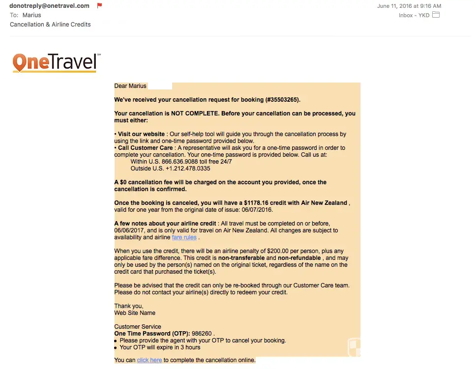 I spent 8-10 hours on the phone, by calling onetravel, onetravel insurance in the us (Seven corners), and air newzealand. Onetravel hung up the phone so many times, but i insisted to get them commit to their service. They didn't. I ended up leaving the credit on my onetravel profile, and using my own money with air newzealand.