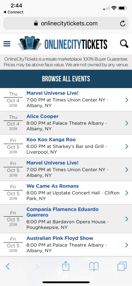 DO NOT BUY TICKETS FROM ONLINE CITY TICKETS! I thought I was buying from the venue, misleading. Stated you could update tickets later. Found I was overcharged but whatever. Tried to upgrade tickets today through their site, they don't do that! Why would they not want to update for money? You just have to resell yourself but no one wants an overpriced ticket in the top level when you can get the same price at a lower level. No refunds, cannot contact to discuss it. Only non-live chat that is billed as live chat. Then I looked them up and they are known for selling FAKE TICKETS! RUN!