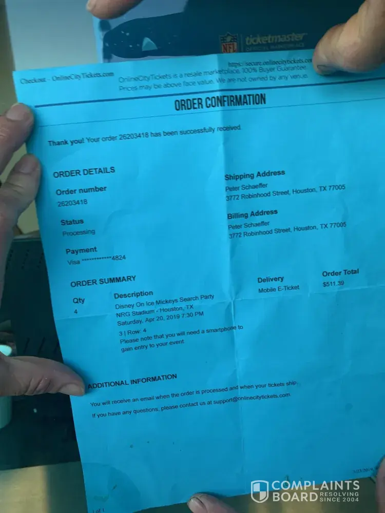 When I contacted OnlineCityTickets to understand if they could void the transaction because it was still pending, they told me it was not possible because that money was already promised to the seller at time of purchase. When I complained about not receiving any communication about the purchase, they gave me the same tagline. In addition, the tickets were listed at $48 per person, and I was actually charged $194 for the full purchase of three tickets. This is an absurd markup from the other vendor I bought tickets from at $30 per piece for a total of $111.