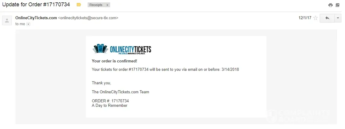 When I tried to work with OnlineCityTickets, they gave me the canned language about all sales being final, and lied to me about sending an email the same day I ordered - I never received that supposed email.