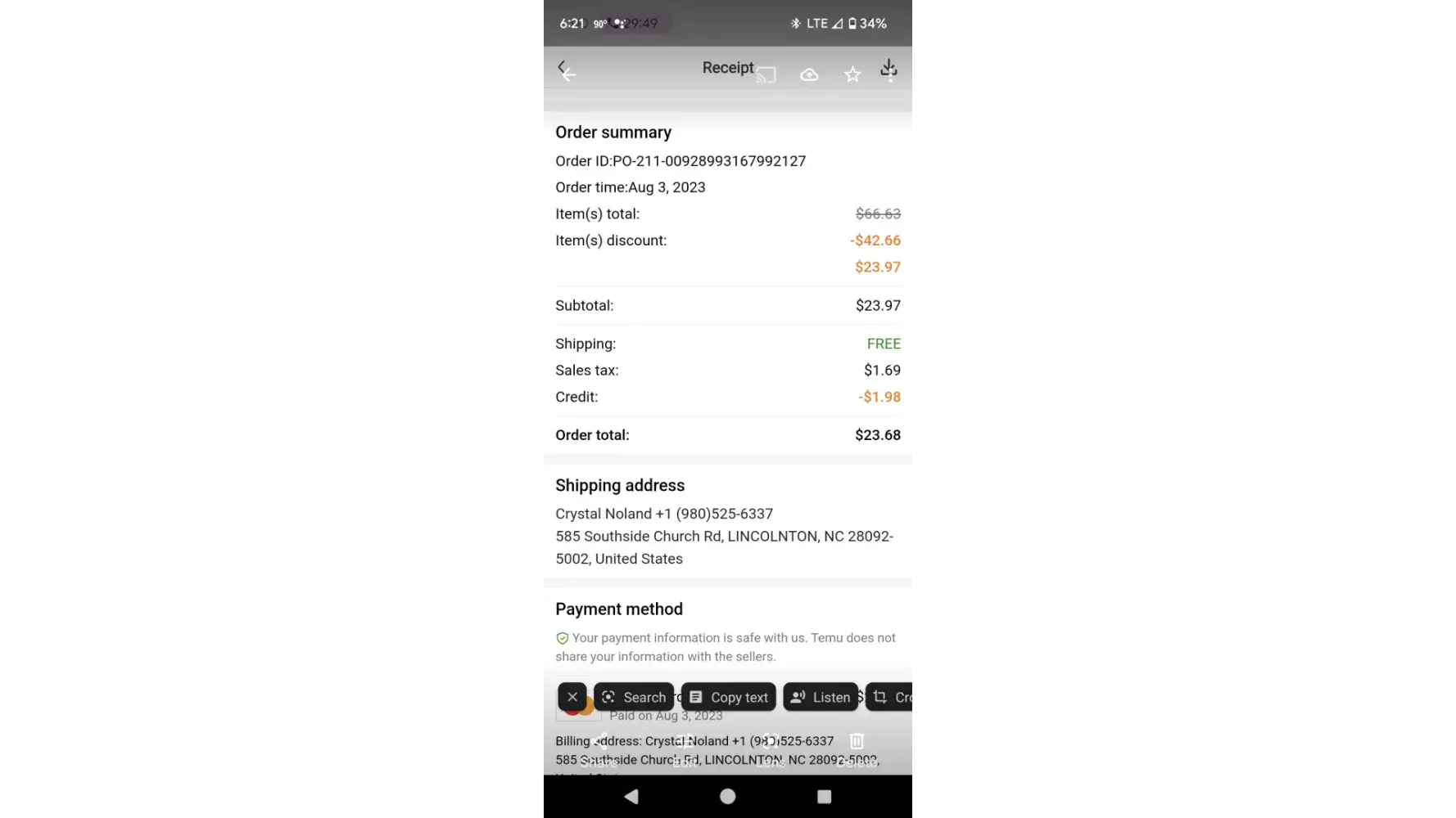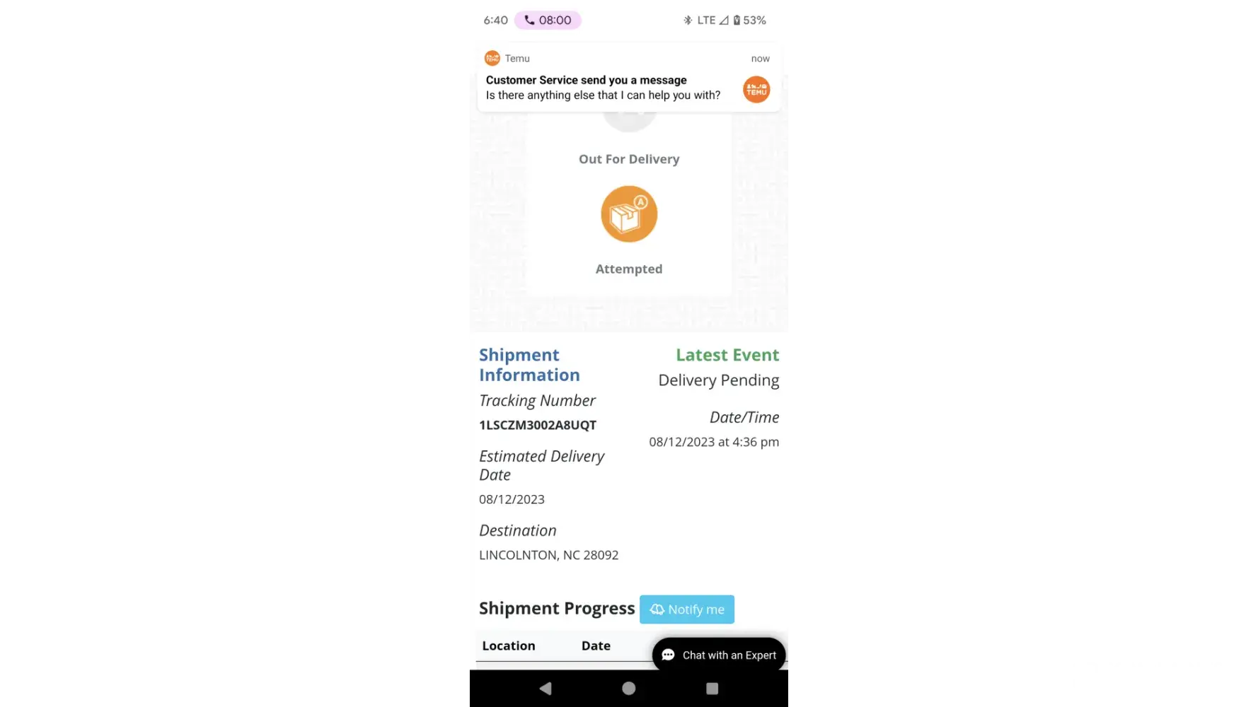 DATE & TIME EVENT CITY 08/17/23 4:14 PM Cannot deliver. Contact sender. 08/15/23 2:06 PM received at the facility. VIRGINIA BEACH, VA 08/06/23 12:45 AM Package data Delivered. VIRGINIA BEACH, VA 08/15/23 9:44 AM Out for delivery. VIRGINIA BEACH, VA 08/15/23 9:21 AM Package scanned at facility. VIRGINIA BEACH, VA 08/15/23 5:58 AM Packaged received...