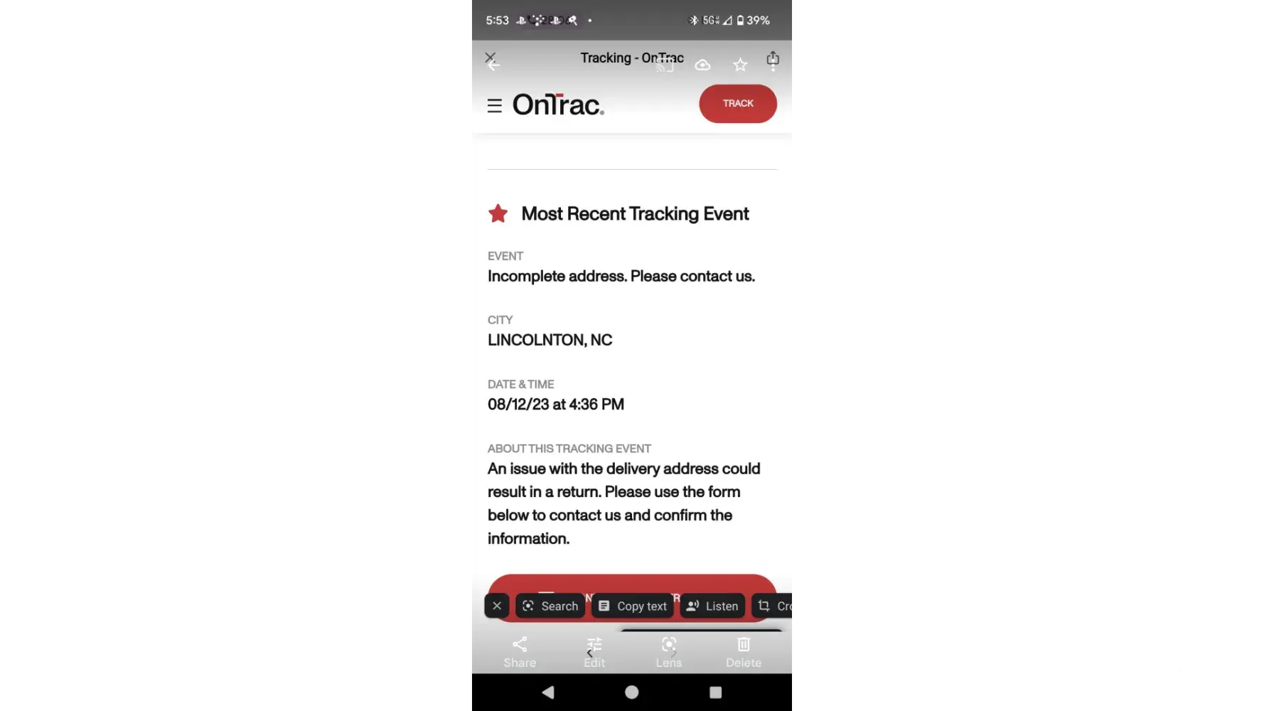 onTrac says delivered but packaged not received