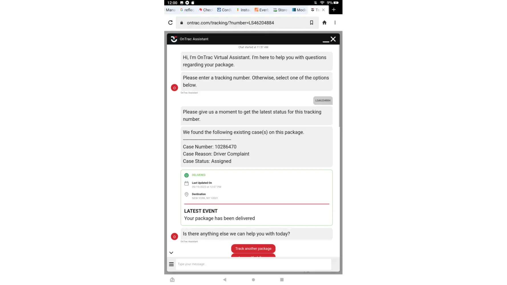 Received notification that package was delivered to my house on 8/14. Package not delivered as I have ring and am notified when someone approaches front door. I notified seller that delivery was not made as stated. Seller said to contact OnTrac as it was out of their control. OnTrac communicated via text ONLY from 8/15 to 8/19. OnTrac’s final response was the following: