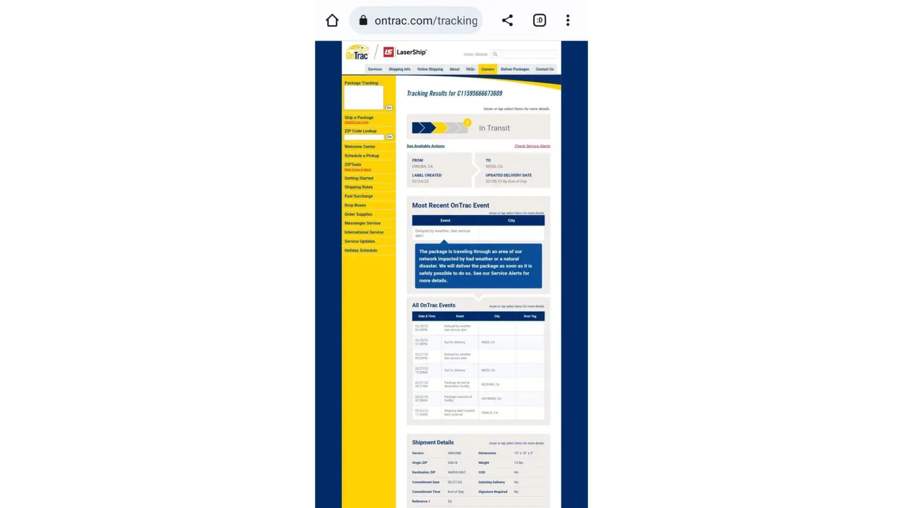 On trac is the worst delivery company and there is no customer services I was waiting for my shipment and never was able to talk to anyone when I went online all I got was that it was pending and after 1 week they said it was sent back to the shipper . They never tried to deliver it these people are habitual liars and how they are in business amazes me.