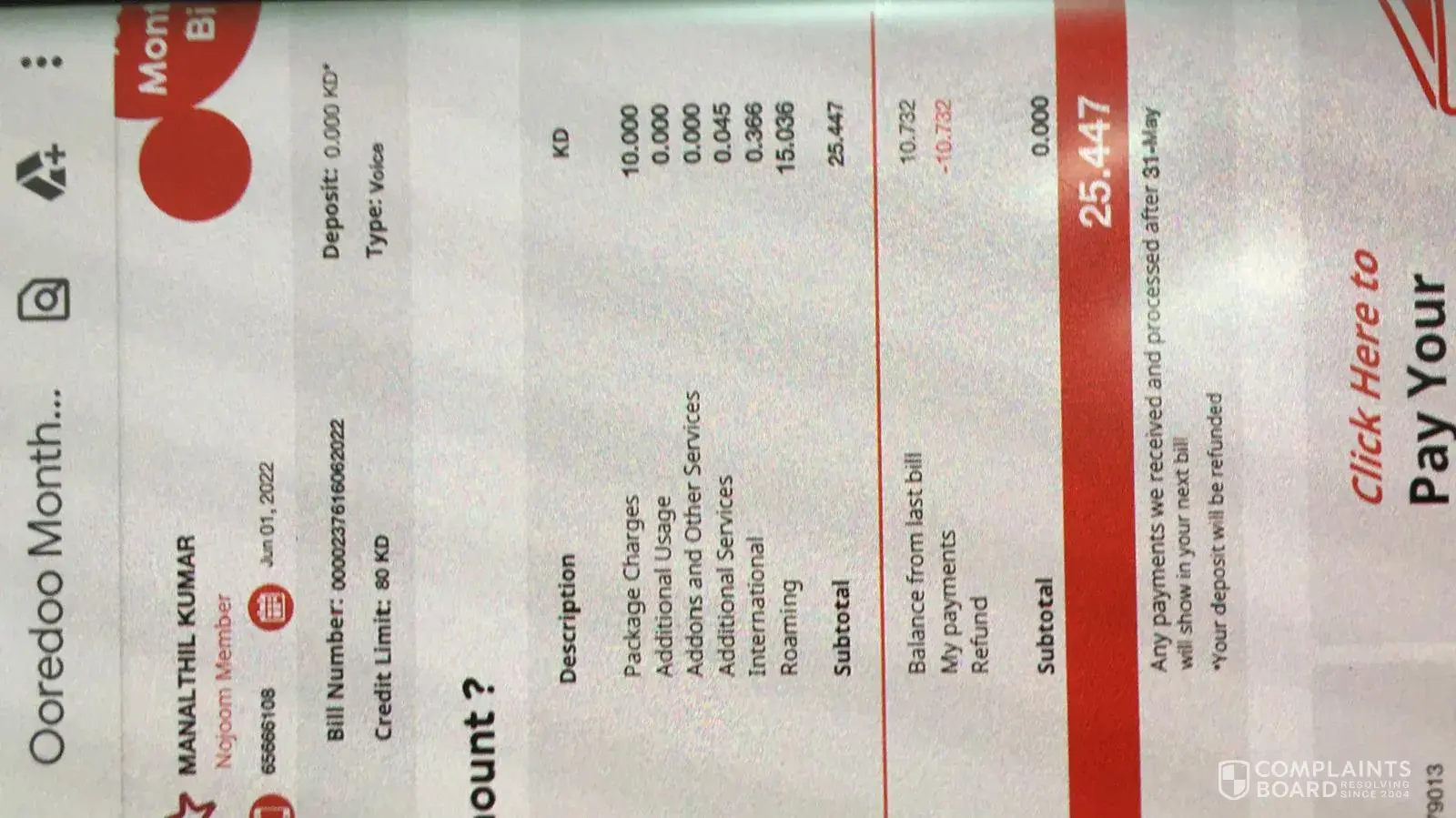 I have registered a complaint through Ooredoo Complaint whatsup on 5th June regarding a KD15.000 being additionally charged to my monthly bill.