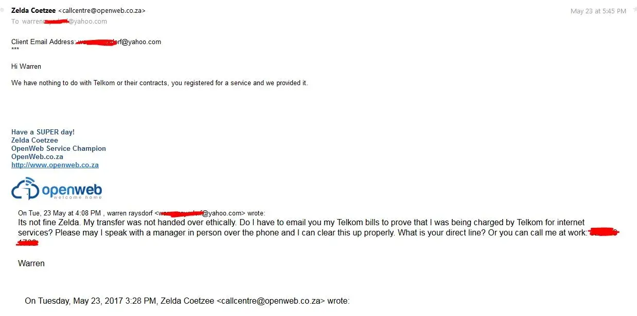 Just some tit-bits for your consideration and to give you a slight insight into the type of “business people” you'll encounter when dealing with OpenWeb: Billing /Accounts complaints on HelloPeter.com makes up for 19% for the entire ISP Industry BUT 30% of all the complaints against OpenWeb. Out of the 23 compliments received by OpenWeb on HelloPeter.com 17 has been first time users with only the single compliment made in OpenWeb's favor with no other trace of their usernames to be found anywhere else on the Internet. 2 of the names was also first time users with only the single compliment made in OpenWeb's favor unfortunately the names were too common to make any connection. The remaining 4 users seems legit but I need to add one user logged a complaint and a compliment. Google the following terms to get a better understanding of the magnitude of the fraud being committed: 1. THE TRUTH ABOUT OPENWEB (71 Pages) 2. OPENWEB ADSL FEEDBACK THREAD (833 Pages) 3. OPENWEB ADSL FEEDBACK THREAD (PT2) (415 Pages) 4. MY HELLISH FIRST EXPERIENCE WITH OPENWEB (14 Pages) 5. OPENWEB ADSL DUPLICATE ACCOUNTS, SHAPING, THROTTLING EXPLAINED(2 Pages) 6. THROTTLING IS RIDICULOUS: ISP(4 Pages) 7. OPENWEB ADSL CLASS-ACTION LAWSUIT(4 Pages) 8. NEW OPENWEB ADSL CONCERNS, COMMENTS (Read user comments) I've been using OpenWeb since 2011 but after logging numerous calls over a period of time about the ridiculous slow speeds and a repetitive cycle of just being issued a new username and password I finally had enough in April 2015. This “support method” would work for a while and then back to a snail's pace speed. I had a 10Mbps Telkom DSL line and a 4Mbps uncapped OpenWeb ADSL subscription at that stage and still the network speed was so pathetic that I couldn't even open Gmail during the day. On 16 April 2015 I send an email requesting that my subscription be cancelled to the support desk as well as to the downgrades department. I received a reply from Zelda Coetzee (Client Care Executive)the same day requesting that I address my request to the cancellations department. Following the instructions given to me by Zelda Coetzee (Client Care Executive) I send the exact same request to the cancellations department on 16 April 2015. To date I am still waiting for a reply from them. On 11 May 2015 I received an account in arrears notification from Open Web's accounts department. I forwarded them a copy of my cancellation request and copies of my correspondence with Zelda Coetzee (Client Care Executive) and as with the cancellations department I am still waiting for a reply.After this I considered the matter closed, I mean how can it not be? I've followed the instructions as given to me and notified a total of four departments within OpenWeb of my request to cancel my subscription. At that stage I changed banks and the account against which debit order was running was now used purely as a savings account and not closely monitored. Imagine my surprise when I took a closer look at my statement a couple of days back only to see that OpenWeb was still running a R339 a month debit order against my account. When I contacted OpenWeb, Robert Cape (Advanced Technical Support)informed me that he is “assuming” the process for cancellations has not been followed as per their T&C's and as such the account has not been cancelled. All because THEY ELECTED NOT TO REPLY to my cancellation request! The phrase that I found interesting in the TERMINATION OF USE AND DOWNGRADES OF THE SERVICE BY THE USER clause of their current T&C's(that was kindly emailed to me by Robert) is the following: Only once a cancellation reference number has been issued will the user's account be deemed to be cancelled.SO IT'S UP TO THEM TO ELECT WHEN THEY WILL ALLOW YOU TO CANCEL. They intentionally delay or ignore your cancellation for financial gain which boils down to plain and simple fraud. Robert advised me to go thou the cancellation procedure AGAIN including the one calendar months' notice period even after he acknowledged that my original cancellation request was indeed received! I find this utterly ridiculous and unacceptable. He also requested me too refer to the T&C's I agreed too when I signed up. I requested a copy of the2011 version of the T&C's and again I am STILL waiting for a reply.