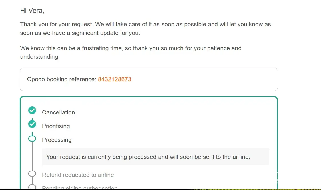 The following days I received two mails from opodo saying that they will asked for reimbursment from the airline company - they had also received it since septembre and they confim it more than twice and it was recorded- still no bank transfer was done...