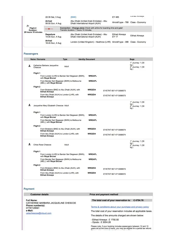 I made the above late booking for me, my mother and daughter on Wednesday 17 July as we had been informed my uncle was about to pass away and we needed to travel in readiness for his funeral on Friday 26 July. I had input all the data on the Opodo booking site, got to the payment page, input card details and confirmed the payment. The booking was showing as 'in progress' but never came up with a screen to confirm the booking/payment had gone through. I kept checking for over 20 minutes but nothing showed so I quit the site and started again assuming the booking had not gone through. I tried to book the same flights but kept getting the message that I couldn't make a duplicate booking. Therefore I had to assume the flights were booked. I checked my bank statement and it showed the money had been processed immediately, so I contacted the airlines (Etihad and Royal Brunei) direct to confirm this was the case. This they confirmed. I then contacted Opodo via Messenger (as was shown on their website) to try and obtain a booking reference number as nothing had come through on my email. I then discovered my email address was typed as cate.[protected]@icloud.com instead of [protected]@icloud.com. Messenger kept asking for my booking ref, which obviously I didn't have and I explained the error with the email address and provided the correct one. I tried to speak to an agent through Messenger, but no one was ever available. Eventually I received the booking confirmation late evening on Thursday 18th July via the correct email address and discovered my mother's surname was incorrect. I have no idea how her surname became the same as mine or my daughter's, i.e., Chescoe. It was supposed to be Monaghan and I have no idea how it had been logged as this. On Friday 19th July I managed to find a telephone number to speak directly with someone in their help centre via a search on the internet (not via Opodo's website - no info on telephone numbers). I was on the phone for +2 hours speaking to their help centre in India (which was a surprise). I was told I had to contact the airlines to make the change to the surname. I contacted the airlines. They said Opodo had to make the change as they were the booking agent. I went back to Opodo and they said they would charge me the airline costs to make the changes plus their admin fee. I refused to pay especially the admin fee because of all the IT issues I had experienced with the non-confirmation of the booking, and previous phone calls to the airlines, poor service, etc. They advised they would waive the admin fee but then told me they couldn't make the changes. I was continually put on hold during the +2 hours on the phone, and ended up by asking them to arrange for their manager to call me the following morning as it was around midnight by then. First I was told that wasn't possible but then they told me it was and to expect a phone call before midday on Saturday 20th July. I waited for the call. None came through. I rang Etihad to find out what my options were. They again told me Opodo had to make the change because they had made the booking. I called the help centre again and was on the phone for another hour trying to sort things being put on hold many times again. I was told they could not get through to the airlines to arrange the change - they had tried several countries so they must be closed over the weekend. I explained I had already spoken to them that morning so that was not the case. I was told to ring on Monday. I couldn't as we were supposed to be flying on Monday. I was then told to ring on Sunday (21st July). I said I couldn't waste any more time or money to do this. The phone calls to Opodo will have cost me plenty already. I was told there was nothing they could do for me, my mother would not be allowed to fly and the call was ended. Not helpful at all considering the circumstances. I then contacted Etihad for the second time that day in tears with frustration and concern my mother would not be able to travel with us. Having spoken to the supervisor, I was advised they could change the surname on the booking for AUD 150. I told them I had no choice but to pay, so they arranged the change. I then emailed Royal Brunei explaining Etihad had kindly resolved the situation for me direct and they also agreed to make the change for approx AUD 180. An additional cost of approx GBP 185 to me. The experience with Opodo has been frustrating, disappointing, stressful and costly. Opodo do not indicate on their website that their help centre staff are based in India. They were difficult to understand and continually changed the story. It would be helpful to arrange for Opodo's website to work correctly, in particular confirm on screen at the time of booking that everything has been processed as well as sending an email confirmation (or maybe this is what the system usually does). I would like some compensation for all the trouble I have been through. I will never be using Opodo again. I can't take the risk. I expect a response by return and will pursue this matter to the end.
