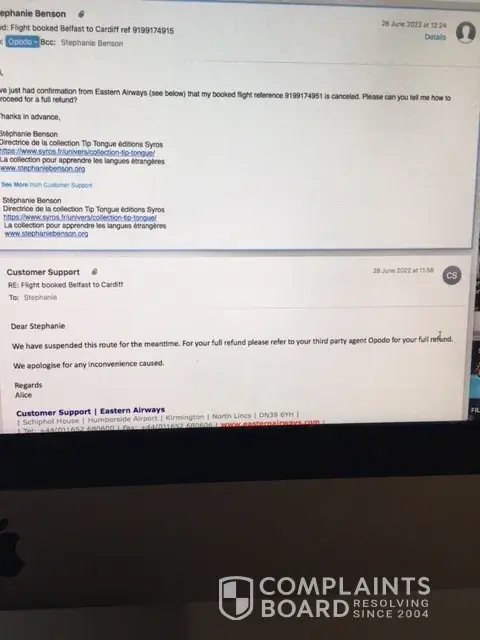 On April 25th 2022 I booked a return flight from Belfast to Cardiff via Opodo for 462.10 euros, and received a confirmation email with booking reference number [protected] and airline reference 1GQQS5 (Eastern Airways). On June 28th, having difficulty checking in, I emailed Eastern Airways who informed me the flight had been cancelled. I contacted customer support at Opodo via their app and chat to inform them of the cancellation and request a refund. I eventually was replied to by a human advisor who wrote to me via the app confirming the cancellation and informing me I would be refunded, as soon as Eastern Airways refunded Opodo, and that this could take up to 3 months. On October 25th, I again contacted Opodo via the app for an update, and was again told I would receive a refund and an update within 72 hours. I had no further news from Opodo. I contacted Opodo again yesterday, November 14th for an update, and could not get past the chatbot who repeatedly said my boooking reference number did not correspond to a real booking. I have since been unable to contact Opodo either via the app or via email.