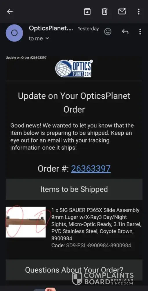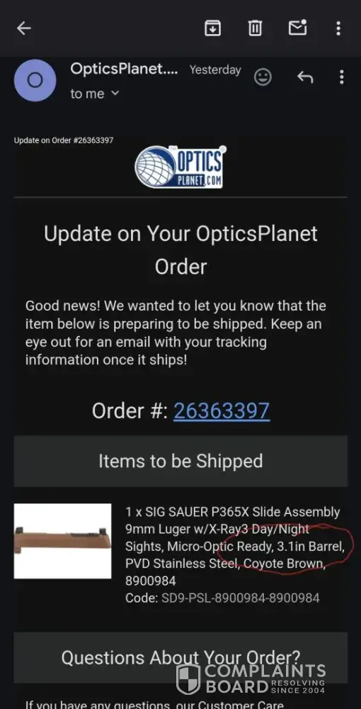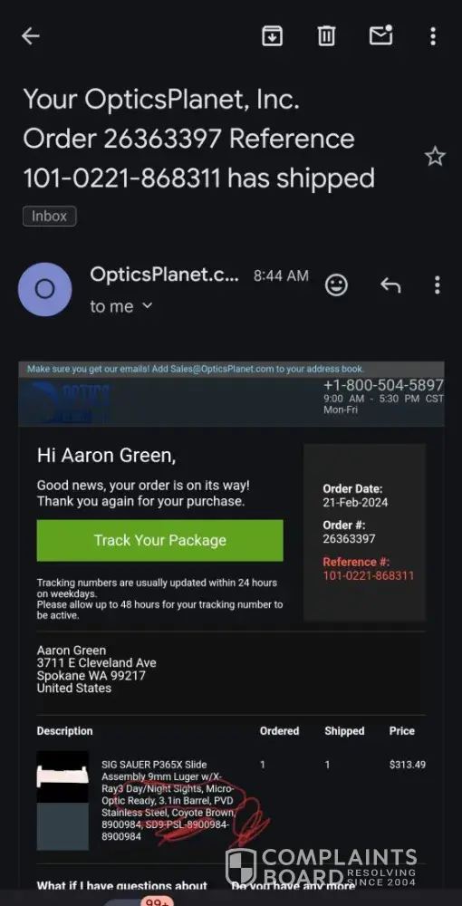 Links to email communcation with Optics Planet (www.opticsplanet.com) customer service.