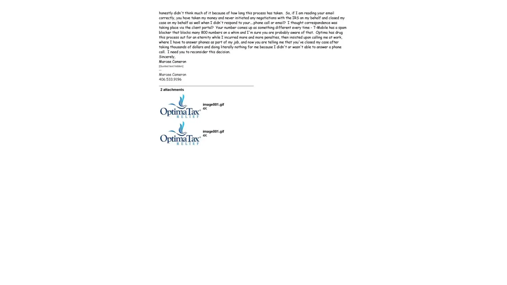 On 9/28/23 I received an email from Angelica Sinajon, Closing Department Customer Service rep at Optima, informing me that my case was being closed due to her being "unsuccessful in reaching you verbally." This is my second encounter with Ms. Sinajon - the first was when she called me at work, despite my REPEATED REQUESTS TO NOT BE CONTACTED AT WORK BECAUSE MY JOB REQUIRES ME TO ANSWER THE PHONE. Before Optima took thousands of dollars from me to negotiate my case with the IRS, they were able to call me in the evenings. Once they had my money in hand, the only hours they were available to discuss my case were 8-5, Mon-Fri. During that first call, Ms. Sinajon assured me that the call would take 5 minutes at the most, then proceeded to reduce me to tears by telling me that the IRS determined how much I could pay them before I ever came to Optima and I had to agree to make the monthly payments or Optima would not be able to begin "negotiations." I have spoken with kinder collection agents. That conversation took place in January or February of 2023, so about 6 months after I gave you my money. I was stunned. Why did I compile $175K worth of medical bills if the IRS was going to base my payment on last years W2? Instead, I incurred 6 months worth of penalties. My case with Optima has been dragging along for more than a year. My last conversation with anyone from Optima was a month or two ago and I agreed to the payments and was told I would be sent paperwork to request penalty relier. The guy I spoke with at that time didn't know anything about any negotiations. I have been watching my client portal for the penalty relief paperwork and have seen nothing, so Ms. Sinajon's email today informing me that my case is being dropped for lack of communication is a shock. I've been waiting over a year to find out that Optima hasn't even spoken to the IRS on my behalf, a fact which is made clear in the email Ms. Sinajon sent yesterday.