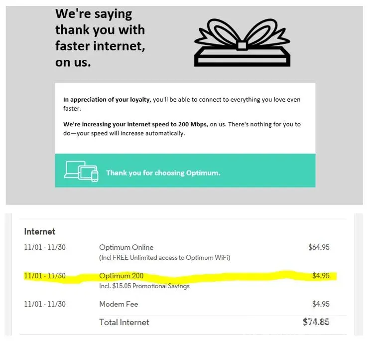On Nov 1st, 2017 I notice that my Optimum Online service has been upgraded without notification to 200mbps and my bill has been increased as well by $4.95.