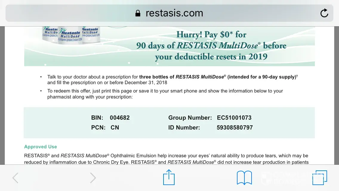 OptumRx restasis multidose vial 30 day supply. coupon for free 30-90 day.co-pay charged for 3 days