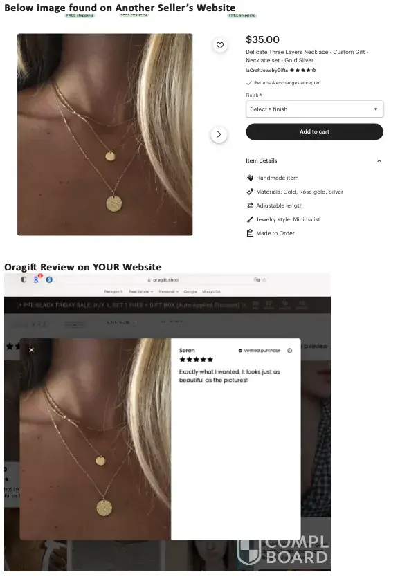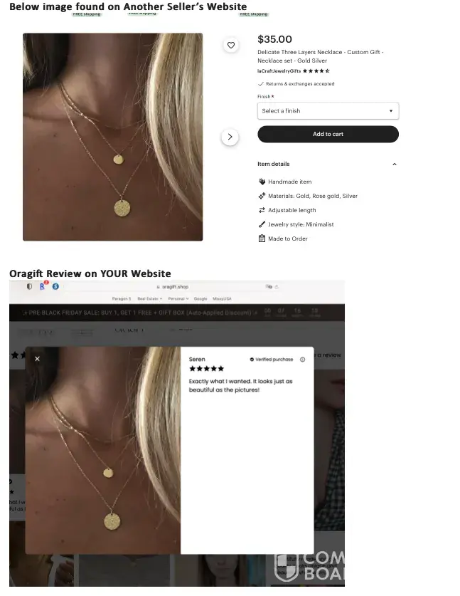 The seller says the other websites stole pictures from her website when in fact, I caught her stealing pictures from another website to use for her fake review. After emailing her about why she is using fake reviews, she stopped responding to my emails.