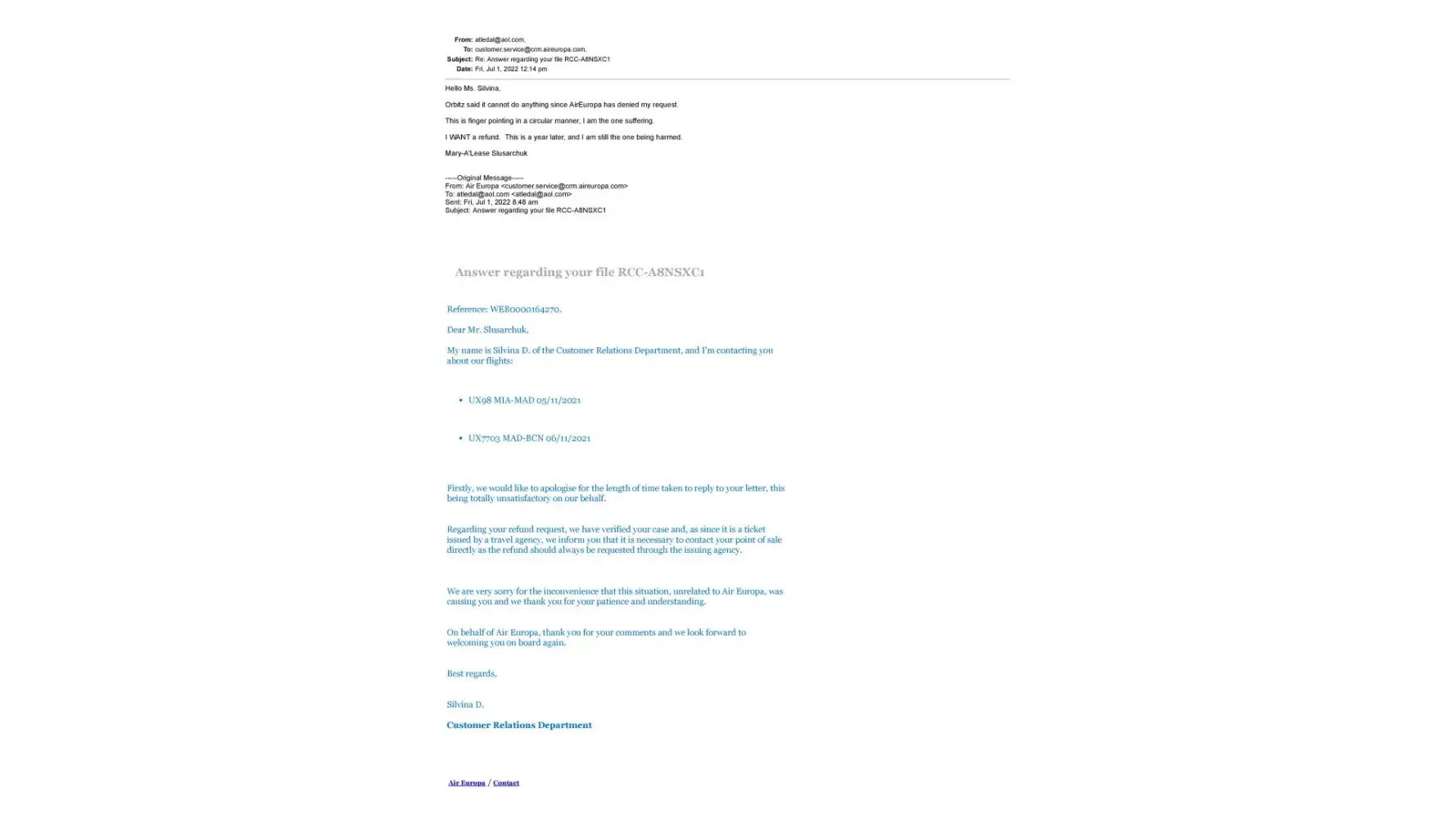 I received an email from AirEuropa stating that my case had been verified. However, Orbitz was responsible for issuing the refund. I have spent over three HOURS on the phone with Orbitz, talking to THREE different agents. NOTHING gets done. I have submitted the letter from AirEurpoa THREE times. I will contact my bank and issue a fraud complaint against Orbitz unless you refund my verified right to a refund immediately!