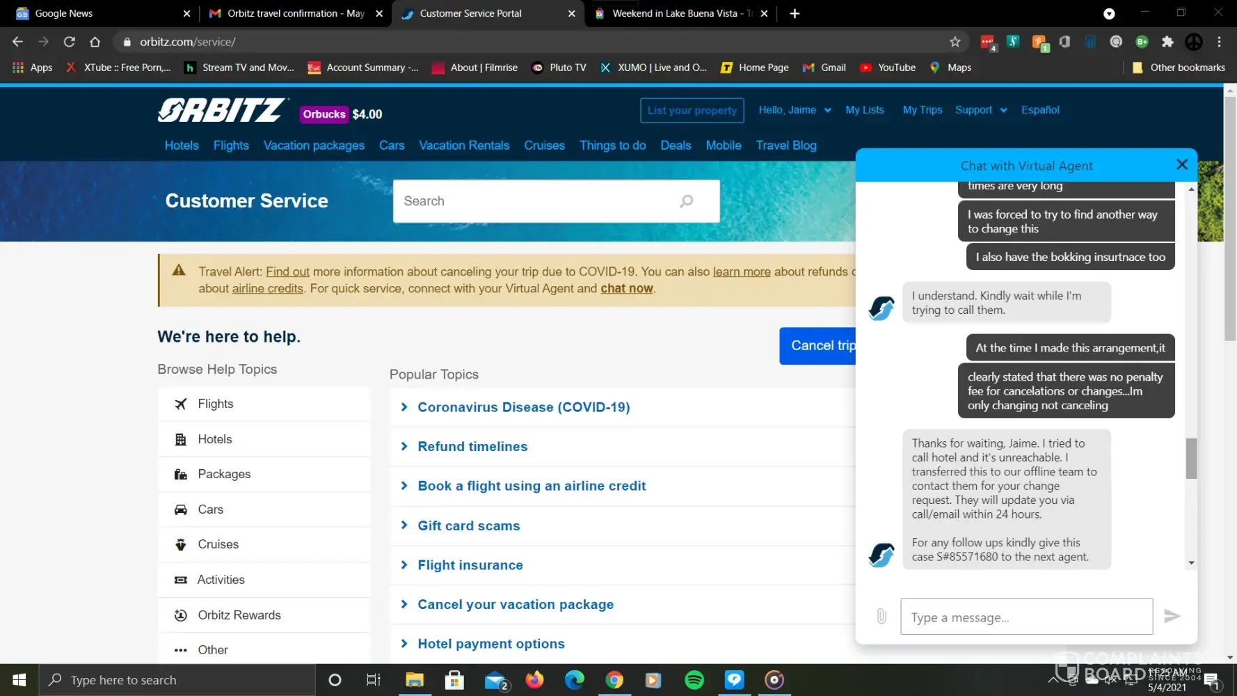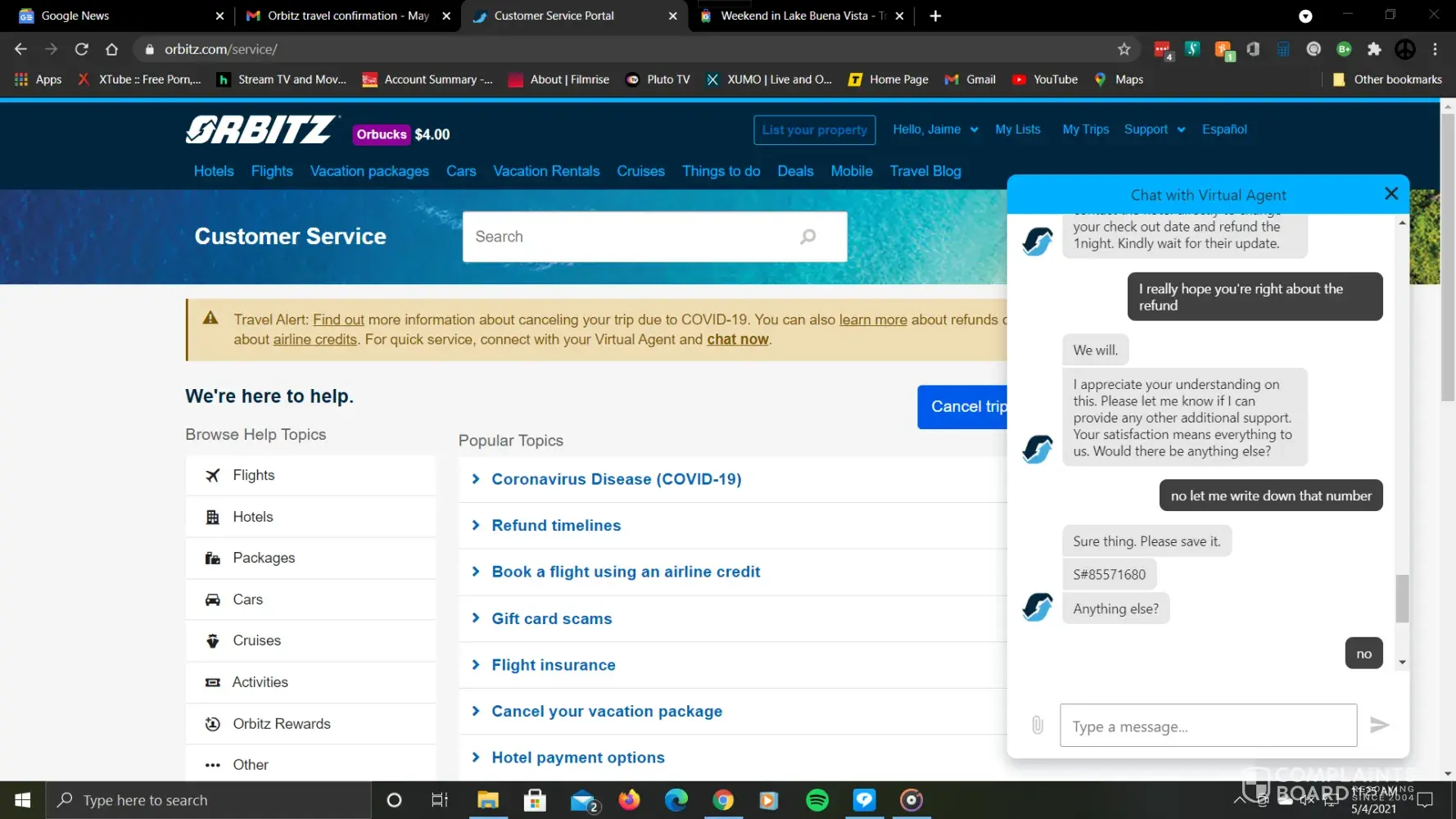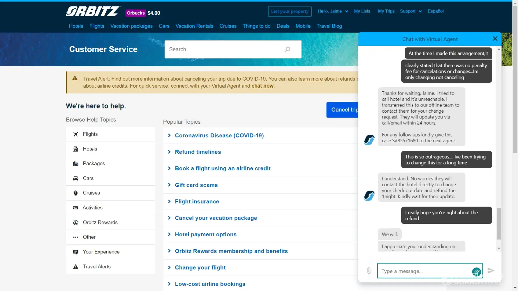We had booked a trip to Florida for spring break 2020, and just like the rest of the world, had to cancel. Car and hotel were refunded, and we had $2800 in flight credit. We decided in March 2021 to fly to Texas because we couldn't afford Florida. After about 3 hours of hold time, we had plane tickets to San Antonio. I never received any correspondence or itinerary as to how much tickets were, but was told by the rep who booked the trip, each passenger had $326 in flight credit remaining. Our neighbors invited us to go to Cancun in June 2021. We willingly agreed to go thinking we still had some credit to use. The online feature to "use airline credits" never worked for me, so I have to call or chat each time. The first rep I spoke with via chat seemed like he was going to take care of me, but about 90 minutes into "creating new vouchers" stated that there were no United flights to Cancun on the days I wanted. (Funny though, their website showed available seats and we did fly United and did not modify the date or time.) The next week, I called Orbitz to try to book flights, and the rep told me United had deactivated the vouchers and I was to contact them to see if they were still valid. I immediately called United, spoke with a rep who referred me back to Orbitz stating they (Orbitz)may have used the entire credit for the trip we took to Texas. I then called Orbitz right back and the rep said she couldn't help me because it was an issue with United. I finally got a supervisor at United involved. She located the remaining credit that Orbitz had assigned to "Misc charge orders." On June 24th 2021 I spoke with a rep at Orbitz who did find my remaining credits. I explained to her that I have spent HOURS trying to get my credits, my Cancun vacation came and went (I am sad to say that I used Orbitz to book my flight to Cancun, paid in full, thinking that I would have received a refund) and at this point I just want my money back. She stated she cannot issue a refund but could send it to corporate for an "investigation" and I should receive an email within 24-72 hours. Needless to say, its been two full weeks and I have not gotten any response. I called today to check the status and was hung up on TWICE. The third time I called I requested a supervisor and she states one will call me within 48 hours. HA. I'll hold my breath...