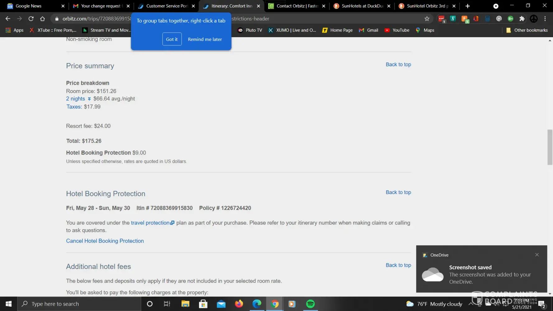 April 26th, 2021, I paid for a reservation at orbitz.com for 2-night stay, May 4th I couldn't stay two nights, but only one night and I tried to change the reservation to reflect that, and Orbitz made that task exceedingly difficult. The reservation was changed, and I never got my refund for the one night that was promised by the representative. After making many phone calls and hours of waiting on hold and conversations with CSR in two countries all I have been getting is the run around. I was told to send in proof that I only stayed one night and after I did that, I still did not get my refund of 85.00. My Itinerary # [protected] and the case numbers that were assigned in stages over the phone were S85571680 and S86902884.