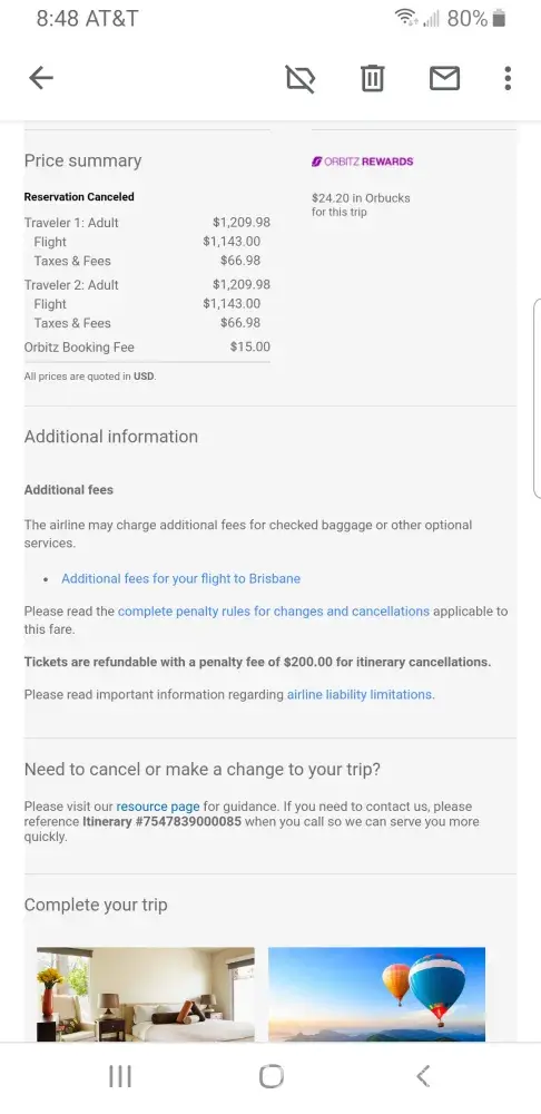 Very bad experience. Due to my husband deployment we had to cancel/postpone his fly ticket. You will think that paying extra for Orbitz and having a protection/cancelation plan, you will have more flexibility but in reality is not like that. They will never refund your money and also they will charge you extra when you will use the credit points or for any additional transaction. In our case, the British Airlines contacted them, asking for a military clause and the Orbitz refused any cooperation or collaboration with them. So, when my husband got back from the deployment, after 6 months, we've tried to use the voucher to reschedule the trip.