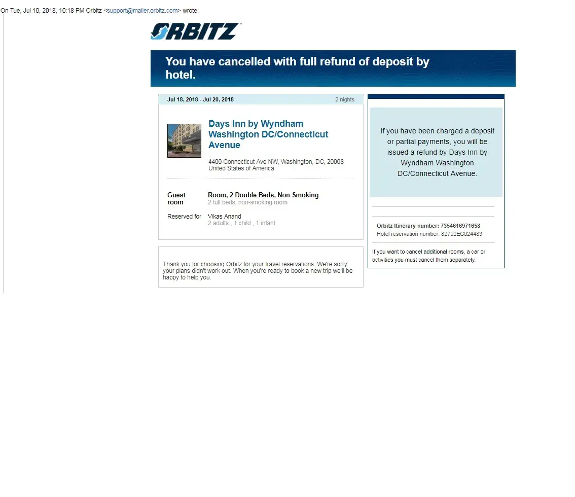 Thank you for choosing Orbitz for your travel reservations. We're sorry your plans didn't work out. When you're ready to book a new trip we'll be happy to help you.