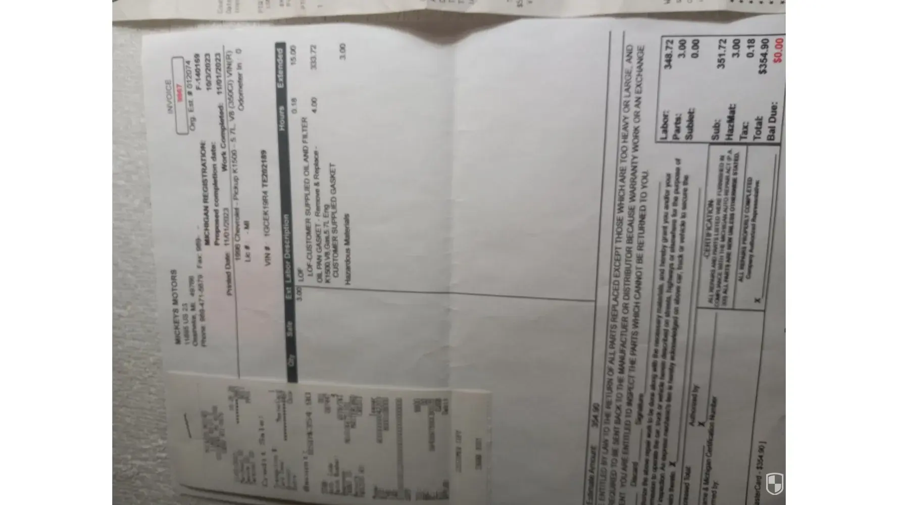 Claimed loss: $354.90 for the repair + parts I purchased for approximately $60.
