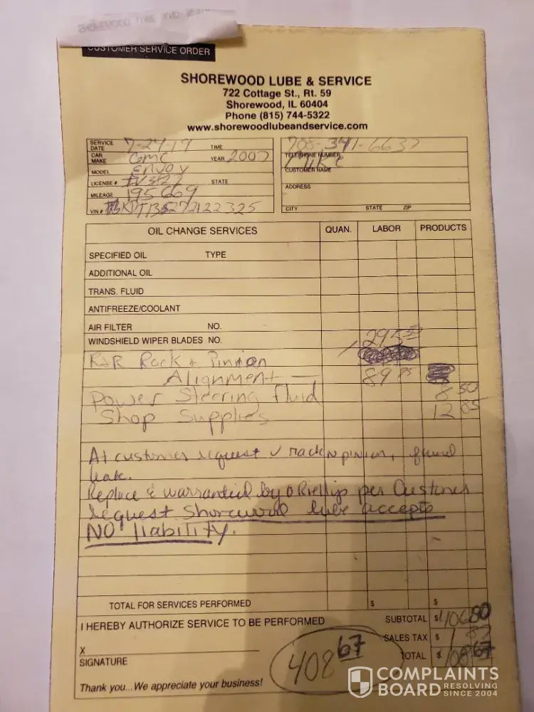 Three months later in July the R & P started leaking really bad again. I went to O'Reilly in Shorewood, IL #4838 and talked to Domingo. He said to take it back to Shorewood Lube for another replacement and they would warranty the R & P and labor . So on 7/24/19 (mileage 195, 669) I did that. Domingo told me that it would take some time and I would go to Shorewood Lube this time to get a check for the labor. I paid $408.67 for the labor. This was no fault of my own that 2 Rack & Pinions break within 4 months. I also had also tried calling Joey Kraska on 9/24/19 and Ken Hubbart (both at the corporate office) and no calls have been returned. I left multiple messages with both. I have waited long enough and would like my reimbursement for my second labor warranty ASAP. Thank you for your attention.