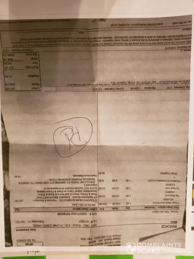 The seals went bad on the way home and Parkway told me to take it to a good place where I live and on 4/8/19 (mileage 192, 511) I took it to Shorewood Lube Service. R & P was replaced with another from O'Reilly's and they said I would receive a check within 30 days a check for the labor. I did receive the labor check in the mail for $408.67.