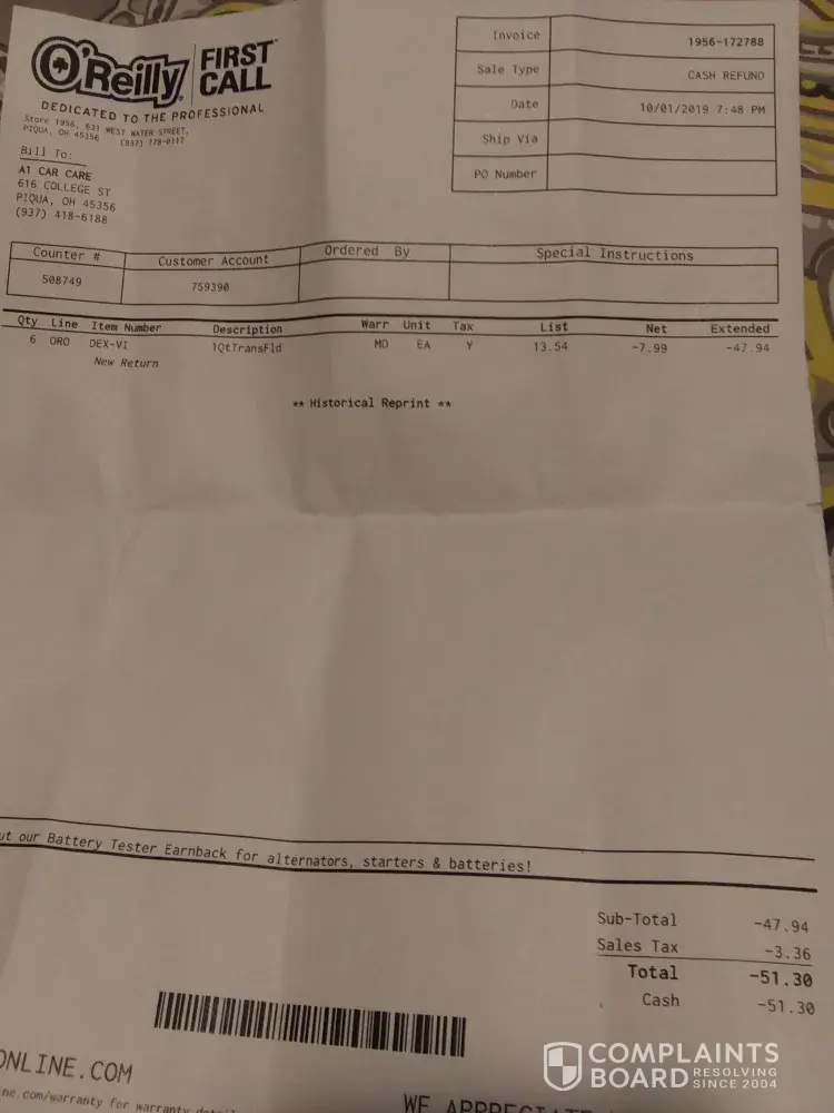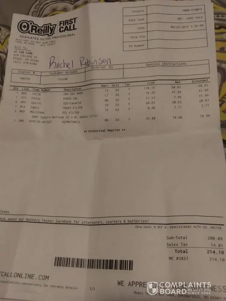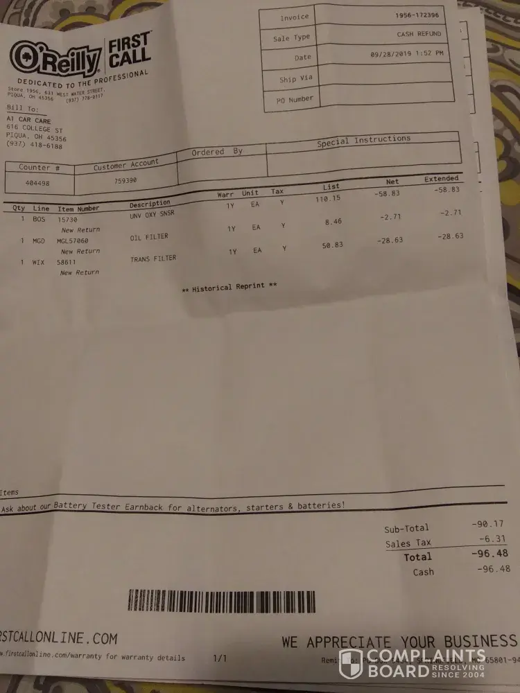 On 9/25/2019 I was going to get my car fixed and the mechanic I had had an account with O"Reilly so I spent $214.10 buying the items for my car so the guy can fix my car. The mechanic acted like he used to work there he was going behind the counter and everything. My car just didn't seem right so I called O'Reilly on 10/14/2019 and gave them the customer...