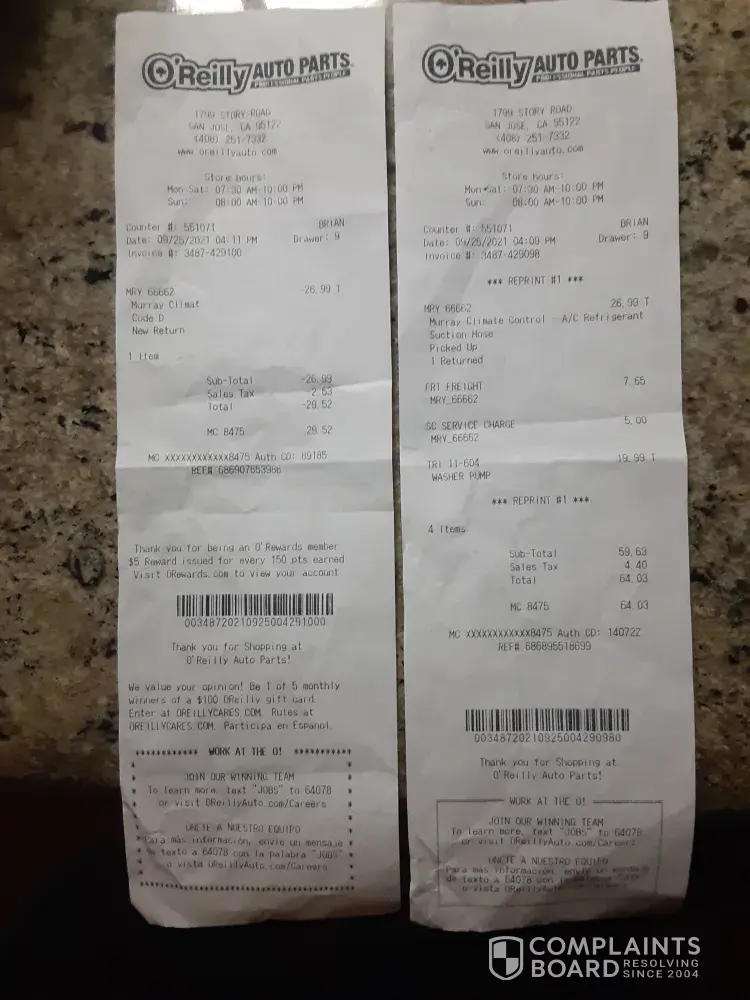 Went to O'Reilly today (8/30/21) to check on some brake parts. Asked if there were any rebates on brake parts, was told that there was a 20% rebate on pads/rotor combination. Sounded good, so bought 4 rotors and pads for my car (counter 593351, invoice [protected]). I utilized the Military Discount. After paying for my order, I asked the sales clerk if she...