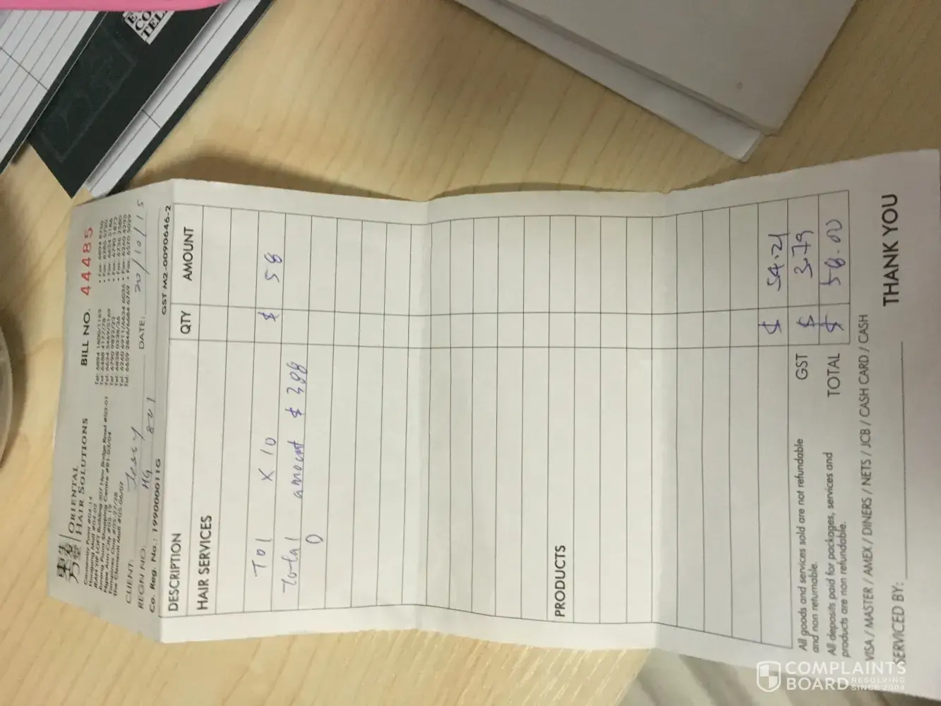 Went to Oriental Hair Solutions from the promotion of $18 for scalp treatment. KNowing that they have hair color treatment, I need to do as well so this sales person Ann asked me to go to the small office room to sign up for a package of $800 after paying $18. After telling me the different packages by writing down on the paper between Hair Color + Scalp Treatment and Hair Color + Scalp Treatment + Hair/mask then I chose the $800 because it made more sense. After the scalp treatment and washing my hair, she said my hair dropped a lot and I need Hair Growth and Hair Stability products and asked me to go to the small room again. And she calculated it will come to $2, 500. I refused to take that package. So she bargained and said what about $1, 800? Top up $1000 from the $800 I have paid.